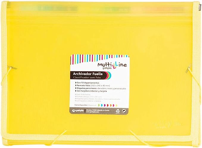 Carpeta classificadora A4 en plàstic translúcid, tipus acordió, 12 departaments interiors. Tancament amb gomes elàstiques. Color groc